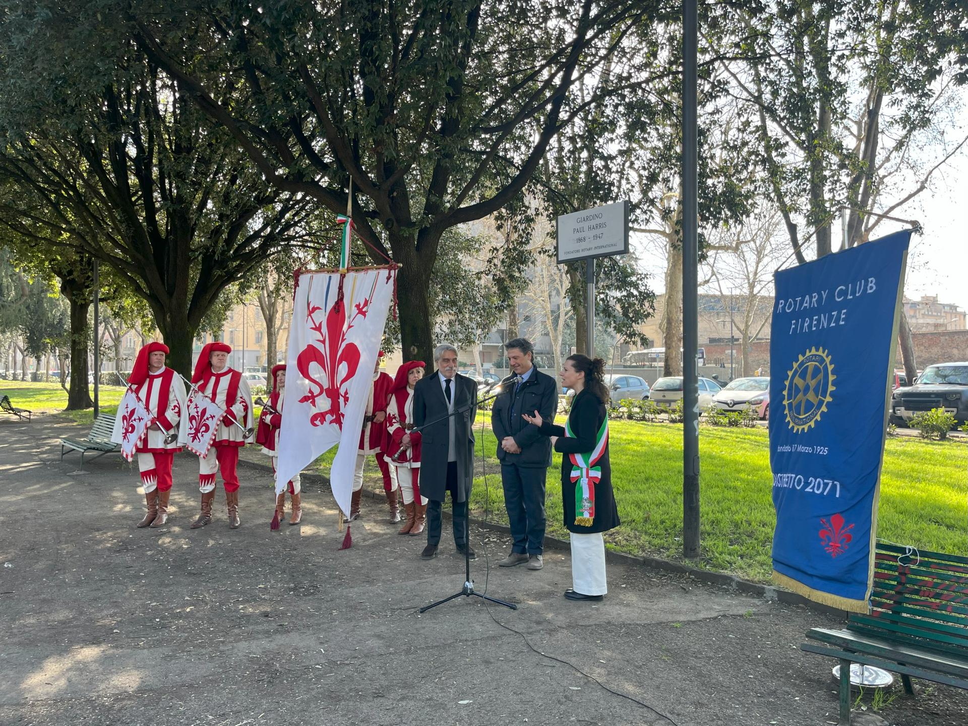 vengono celebrati i 120 anni del nostro sodalizio ed i cento anni del Rotary Club Firenze. Ed è bello ritrovarsi oggi in questo giardino dove i giovani e i cittadini, passeggiando ed incuriositi di questo nome, Paul Harris, potrebbero fare una ricerca su internet e scoprire cosa abbiano fatto lui ed il Rotary per la collettività. Permettetemi inoltre di ringraziare il Comune di Firenze per il grande lavoro svolto fianco a fianco per intitolate uno spazio pubblico al nostro fondatore, cosa non semplice per i molti adempimenti e non solo burocratici da svolgere per arrivare a questo importante traguardo per la Citta ed il nostro Rotary! ».